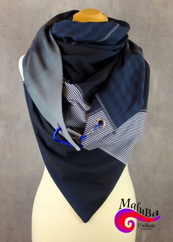 Artikel-Nr.: SB-DT0020/9-1 Kategorie Kopf und Hals, Sofortkauf, UnikateDieses große Dreieckstuch ist ein Einzelstück und aus drei verschiedenen Sommersweat-Stoffen gefertigt. Wunderschöne maritime Blautöne kombiniert mit weiß und grau. Das Tuch ändert seine Optik je nach dem welche Seite man vorne trägt. Geschlossen wird das Tuch mit zwei Deko-Karabinern (nicht zum Klettern geeignet – vor dem Waschen entfernen).